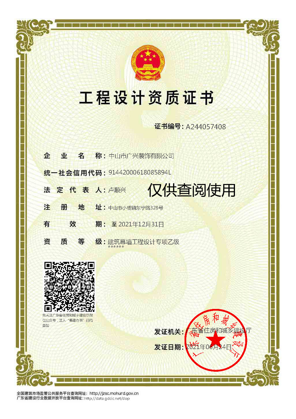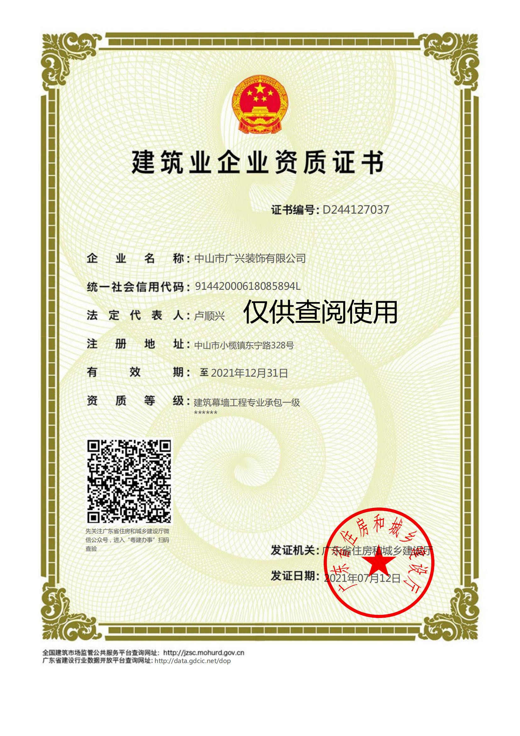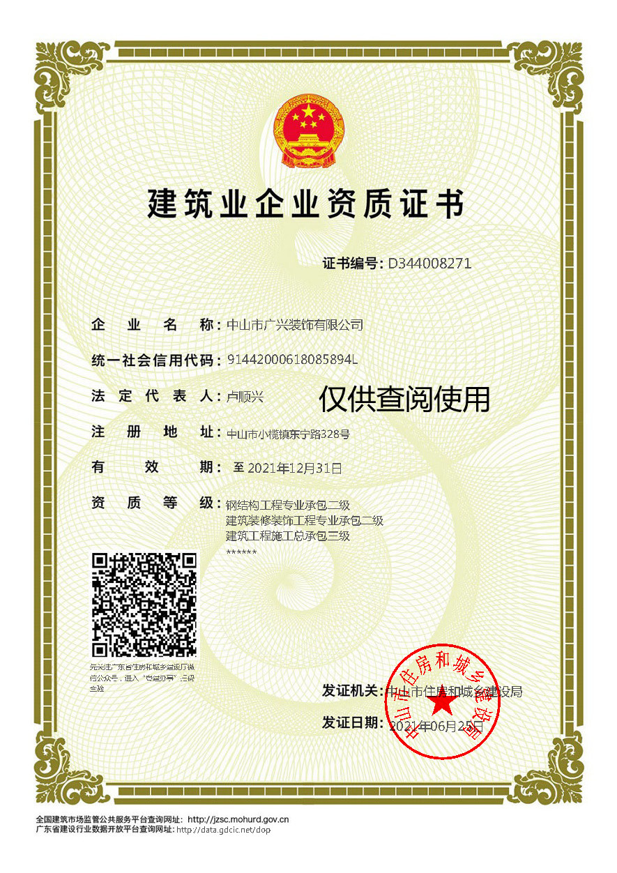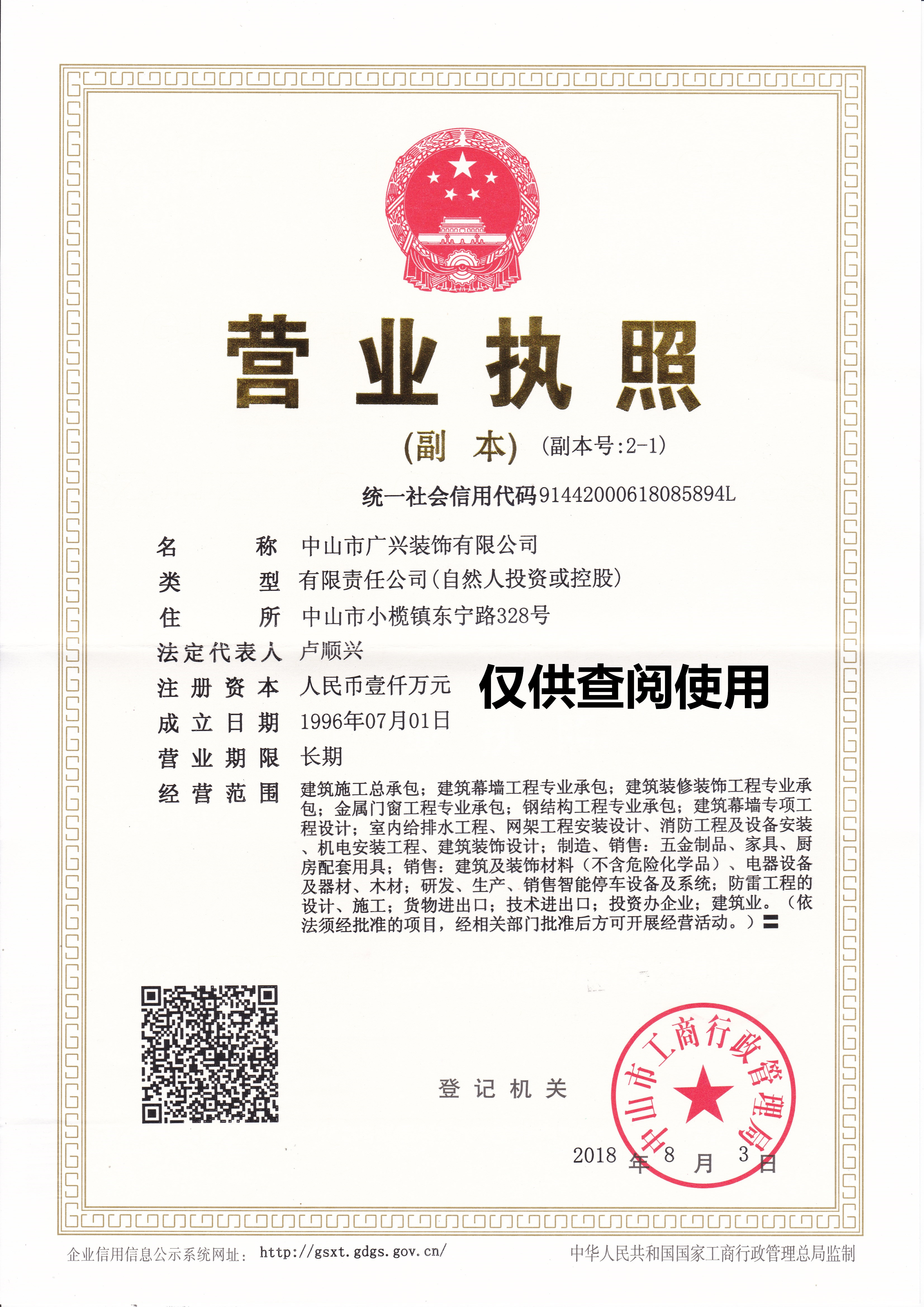 中山市廣興裝飾有限公司創(chuàng)建于1985年,是一家集鋼結構、建筑、幕墻、裝修裝飾、鋁合金門窗專業(yè)的設計、加工及施工安裝為一體的大型綜合性建筑企業(yè)。公司總部位于中山市小欖鎮,在中山和珠海均建有生產加工基地,總占地面積60000多平方米。